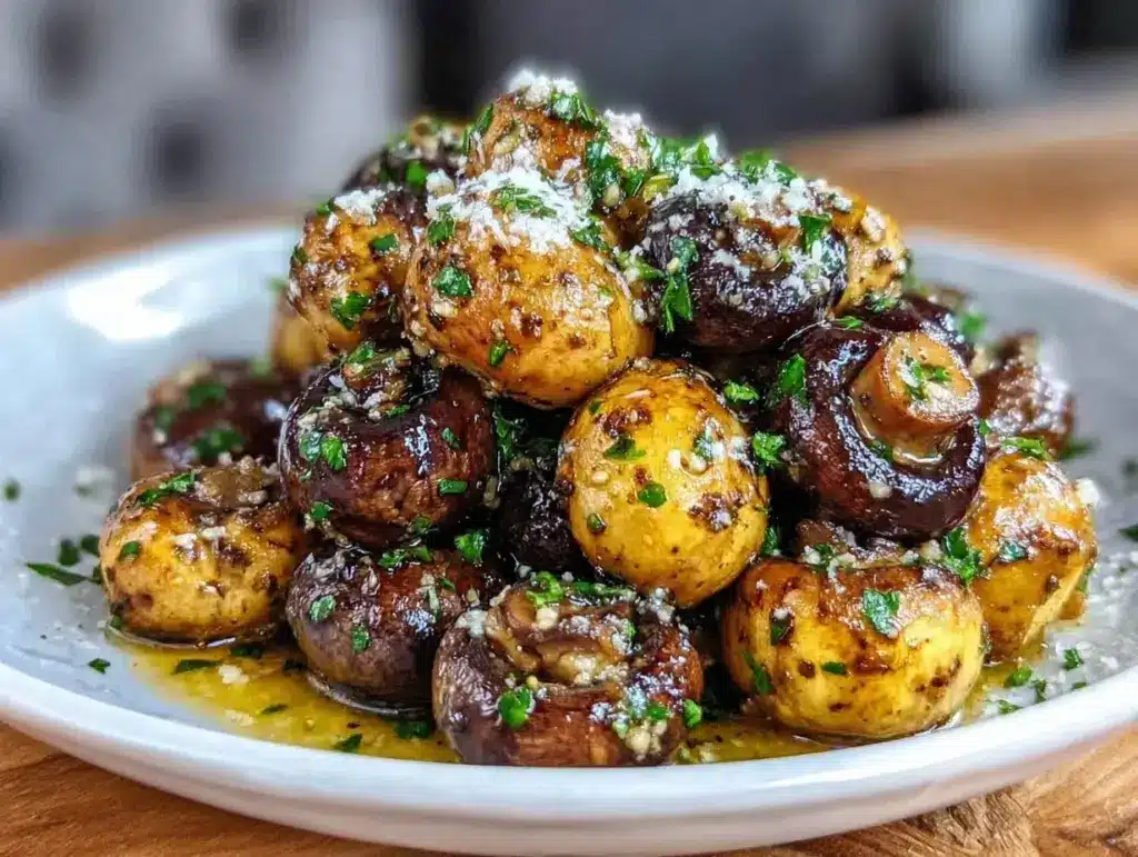 Keywords: air fryer mushrooms, garlic butter mushrooms, roasted mushrooms, easy side dish, vegetarian, gluten-free, quick recipe, cremini mushrooms, baby bella mushrooms