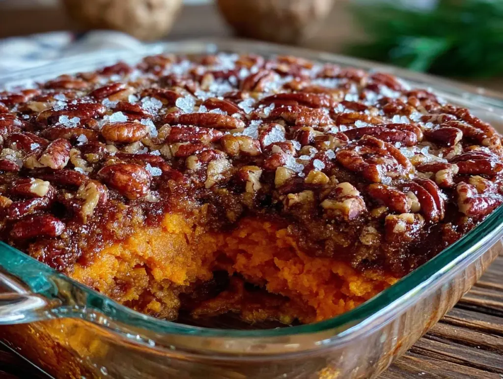 Keywords: sweet potato casserole, holiday side dish, pecan topping, easy casserole, Thanksgiving side, crunchy topping